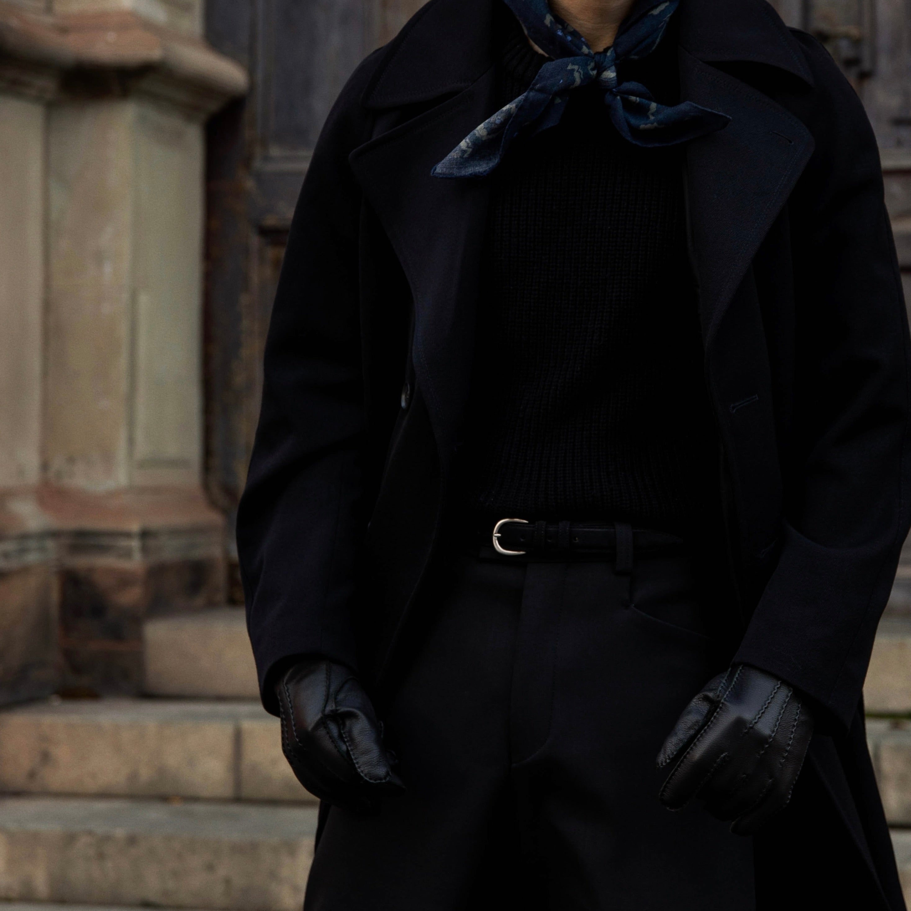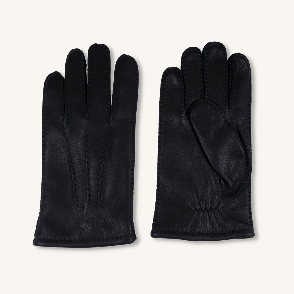 Crafted from extra-soft and thick deerskin with a beautiful natural texture, these black gloves offer style and comfort. Featuring elegant seam details and a warm beige wool lining, they are designed to keep your hands warm while maintaining a refined look. Perfect for adding a touch of sophistication to your cold-weather wardrobe.