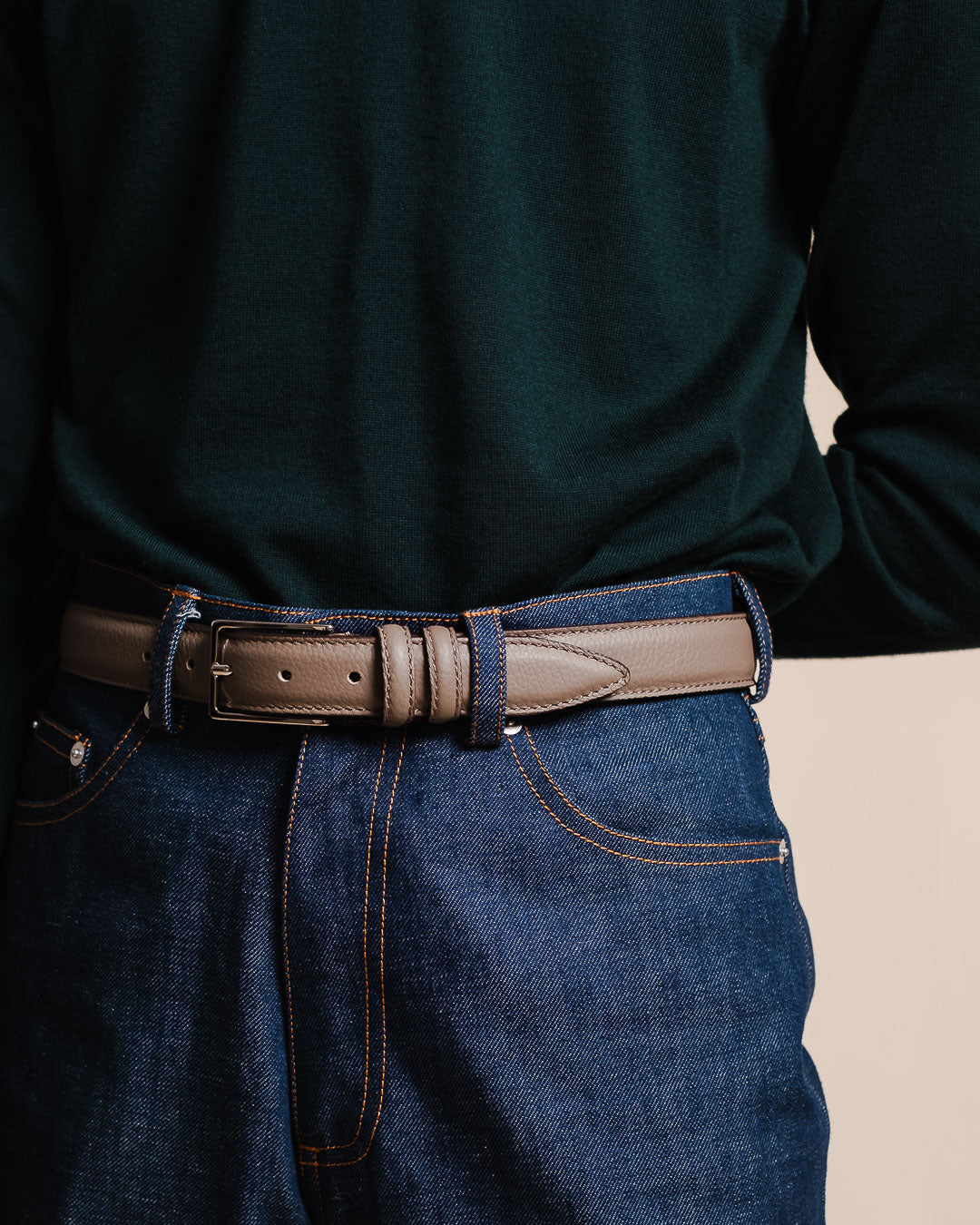 Introducing our extra soft Taupe Leather Belt with a beautiful structure in the leather matched together with an elegant classic silver-coloured buckle. Detailed with a tone in tone seams. A timeless accessory made to last in your closet and crafted with precision and care in the heart of Italy, this belt embodies sophistication, quality, and versatility.
