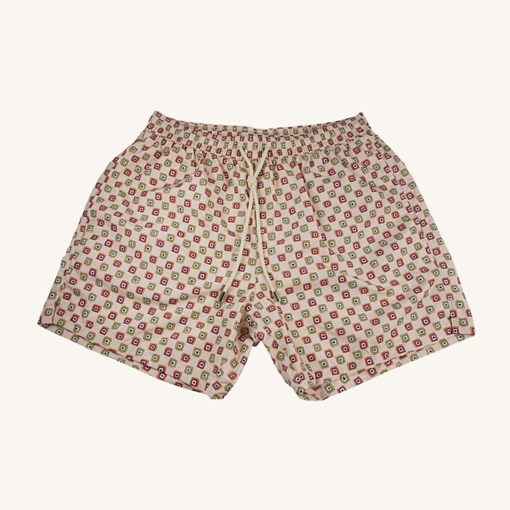 Experience the uniqueness of our new men's swim trunks, inspired by our rich archive and the collection's heritage. These board shorts are one-of-a-kind and come in various patterned and solid colour options, such as navy blue, dark green, yellow, burgundy, and light blue. This allows you to express your personal style.