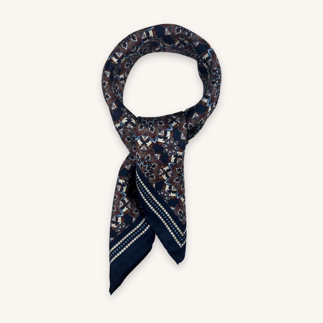 Blue Silk Bandana with a beautifully detailed pattern, crafted in the heart of Italy. The combination of off-white, beige and blue blends nicely in this printed silk bandana. This bandana is a great essential to add to your everyday style or for more dressed occasions. Tie a loose knot and wear it with a knitted sweater, shirt or t-shirt.