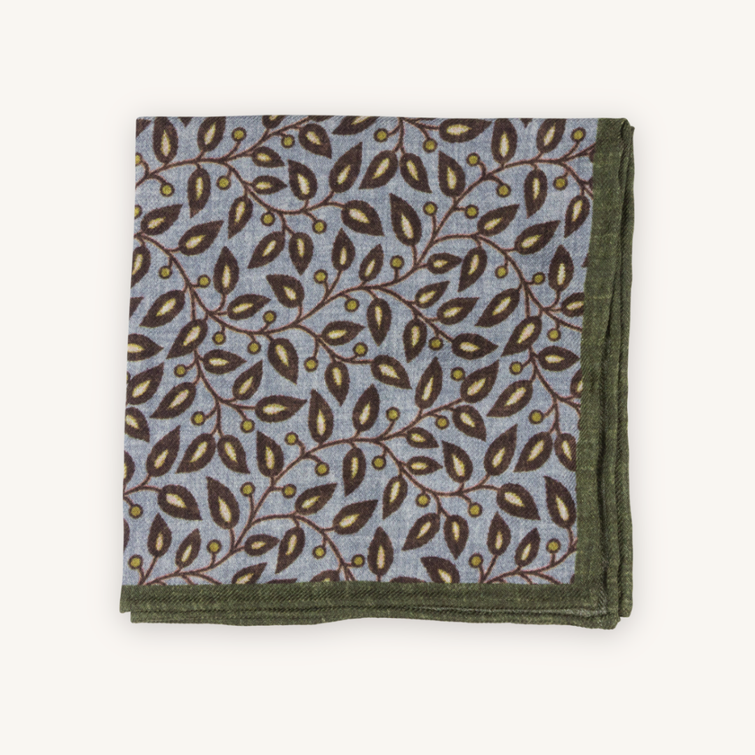 Wool and silk blend pocket squares with detailed leaf patterns in colours of grey, green and brown colours. The lovely pattern adds an extra twist to your ensemble. Enhance your attire by tucking this Pocket Square into your jacket pocket. Its luxurious texture and detailed pattern effortlessly elevate your look, making a statement of timeless elegance and impeccable taste. Why not add a solid wool tie to match it?