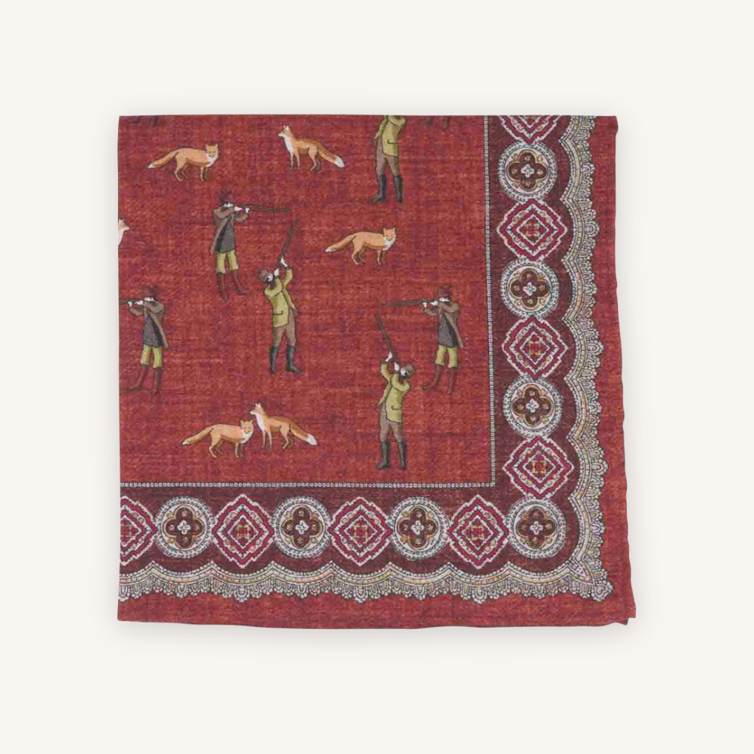 Wool and Cotton blend pocket squares feature detailed hunting patterns on a rich, warm melange orange ground. The lovely pattern adds an extra twist to your ensemble. Enhance your attire by tucking this Pocket Square into your jacket pocket. Its luxurious texture and detailed pattern effortlessly elevate your look, making a statement of timeless elegance and impeccable taste. Why not add a solid tie to match it?