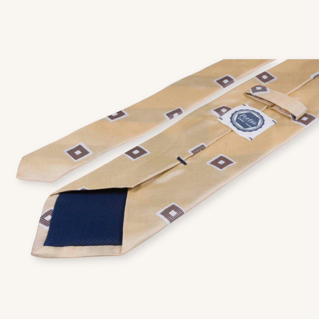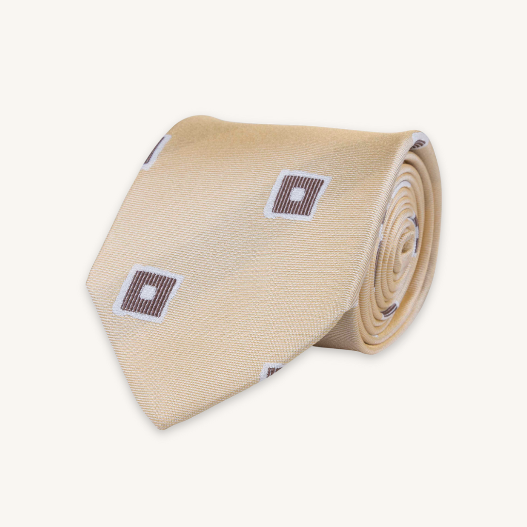 Our woven light yellow silk tie is a favourite this season. You will stand out in this beautiful yet bold tie. Wear it with this season's light beige suits with a jeans shirt, and we promise you will receive great compliments. Combine it with a brown pocket square.