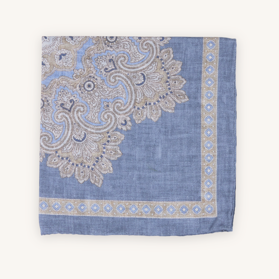 Silk pocket squares showcase two beautiful patterns. One large pattern on a rich, warm melange blue, the versatility of having two pocket squares in one adds variety to your wardrobe. By tucking this pocket square into your jacket pocket, you can enhance your attire with its luxurious texture and detailed patterns on both sides. It effortlessly elevates your look, making a statement of timeless elegance and impeccable taste.