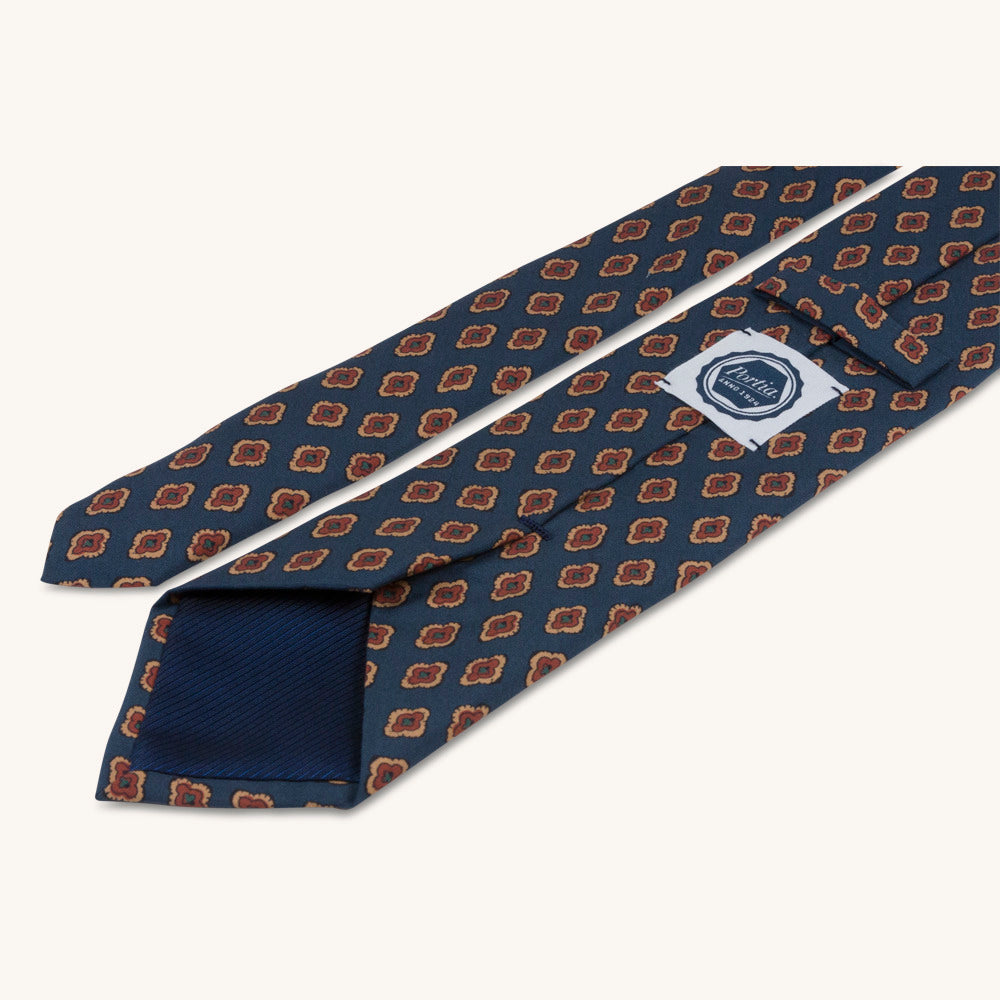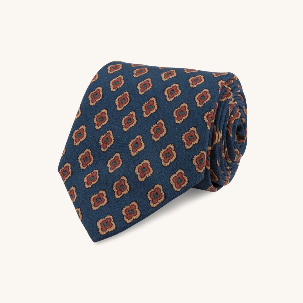 A retro-inspired medallion pattern printed on a blue ground on our favourite Silk Tela fabric from Como, Italy. We love this silk material because it gives a matt finish and tones down the colours for the Autumn season. This tie is ideal for a more modern business look.