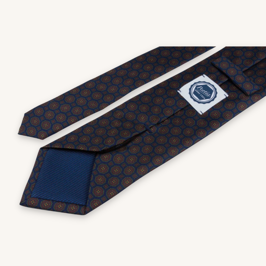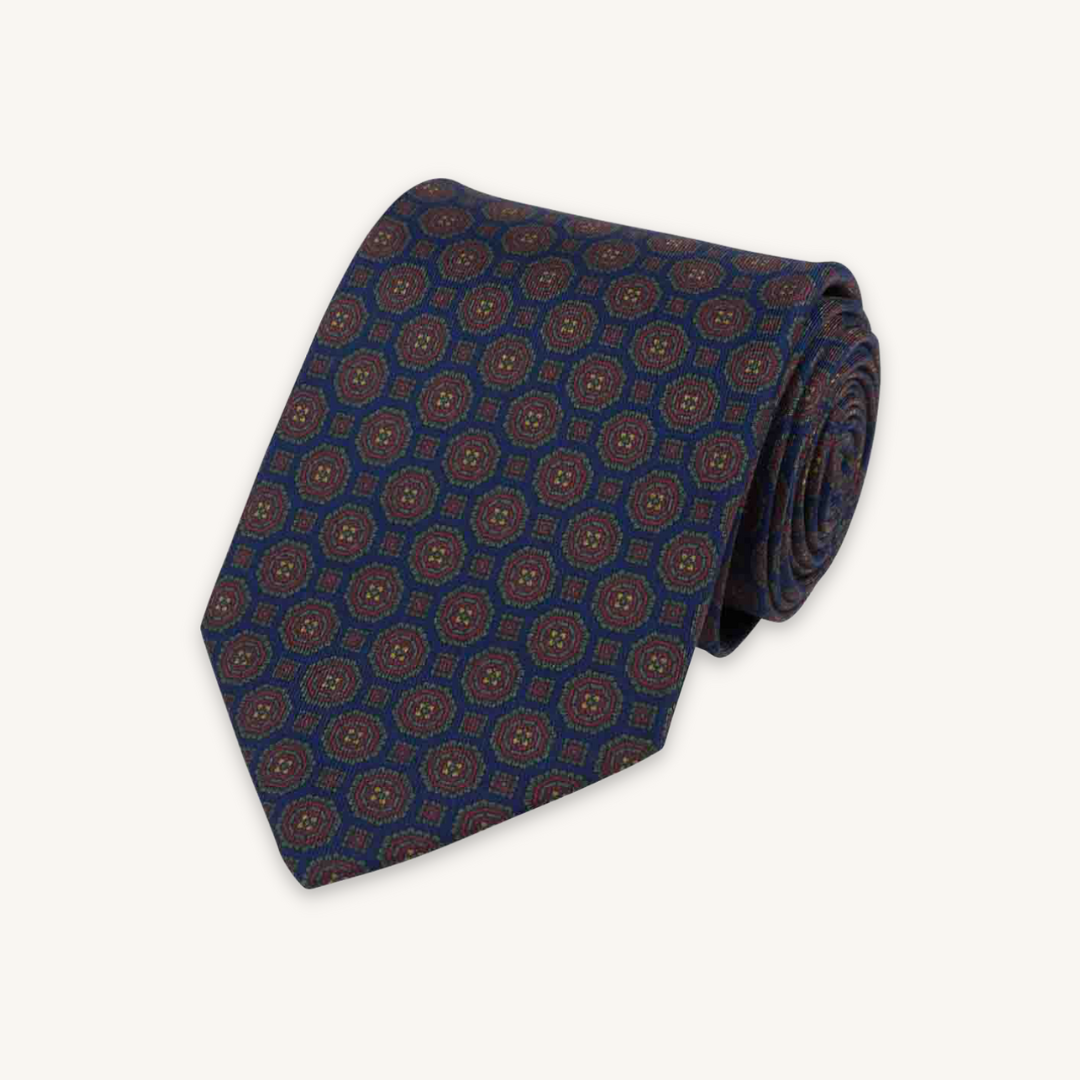 This sophisticated necktie is crafted from timeless silk twill material selected from the region of Como, Italy. It features a dark blue base with a striking medallion pattern in deep, complementary colours. This tie is not only exquisite but versatile, suitable for a wide range of occasions. It's also the perfect choice for those aiming to achieve a contemporary and stylish appearance.