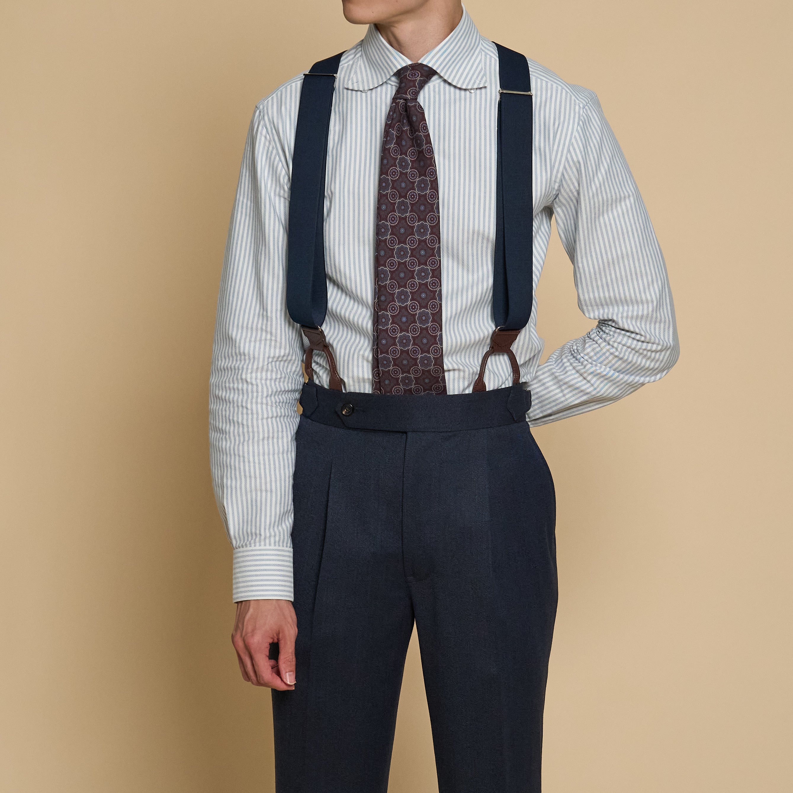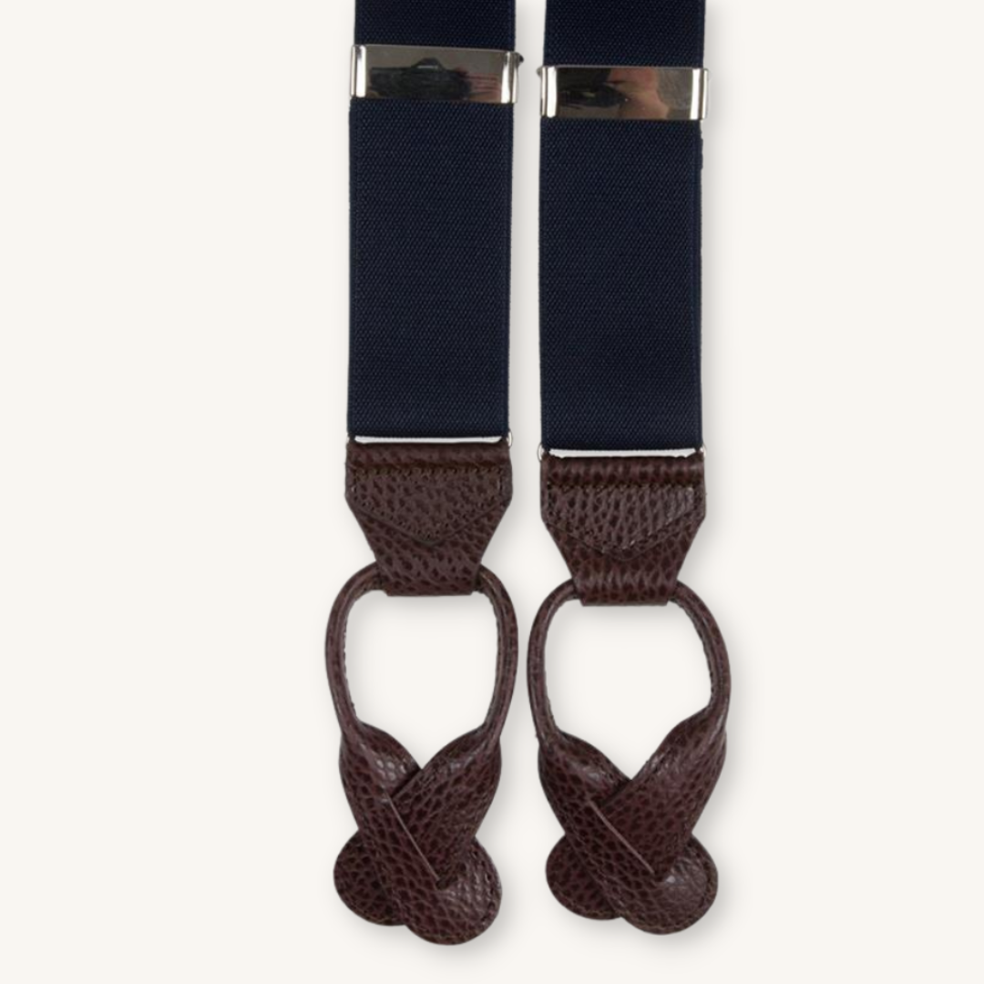 A pair of classic and elegant suspenders are a must-have in your closet. These are solid dark blue with an elastic band and dark brown leather toggles. One of our most exclusive suspenders. The elastic band is double-coloured on both sides, making them extra elegant and perfect to wear for a more dressed look. Made in Italy.