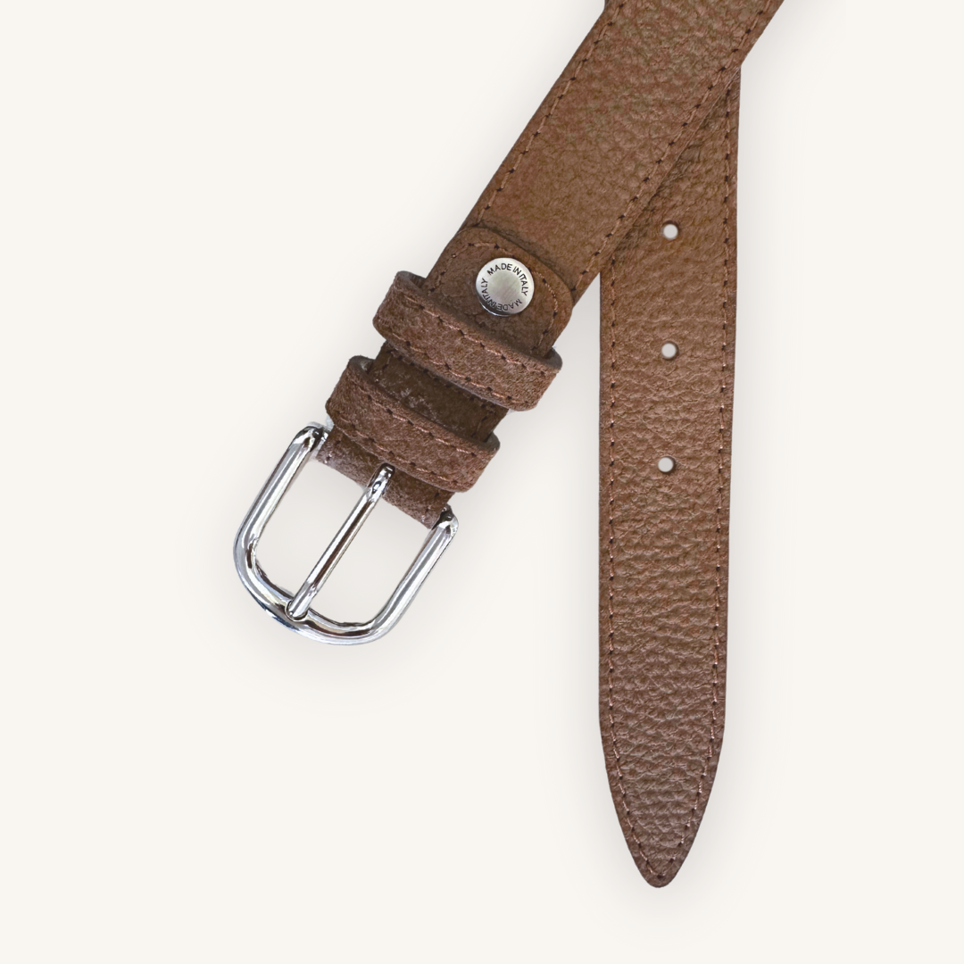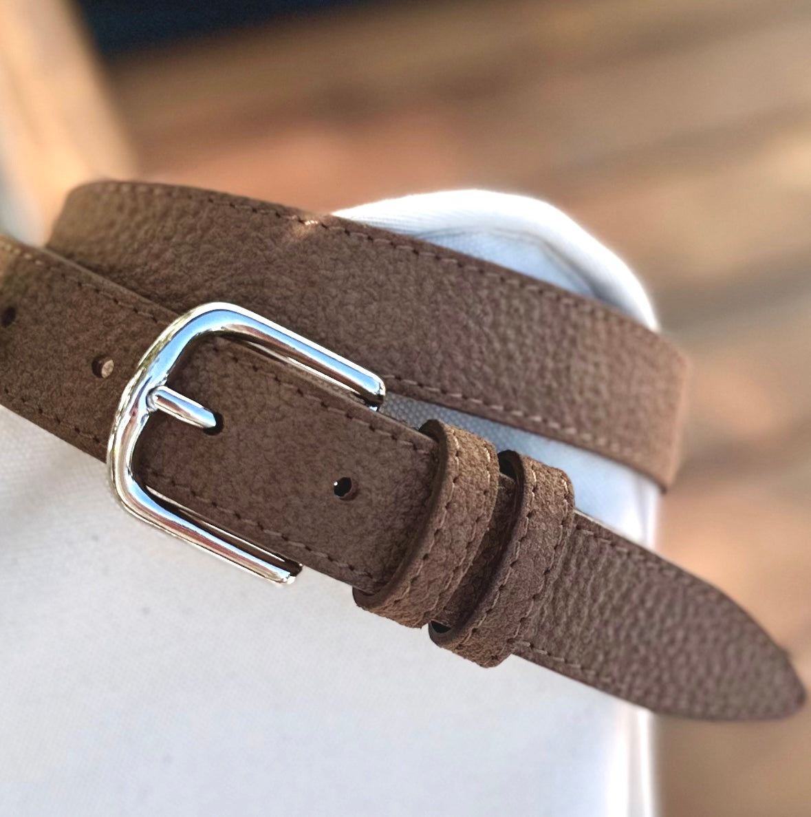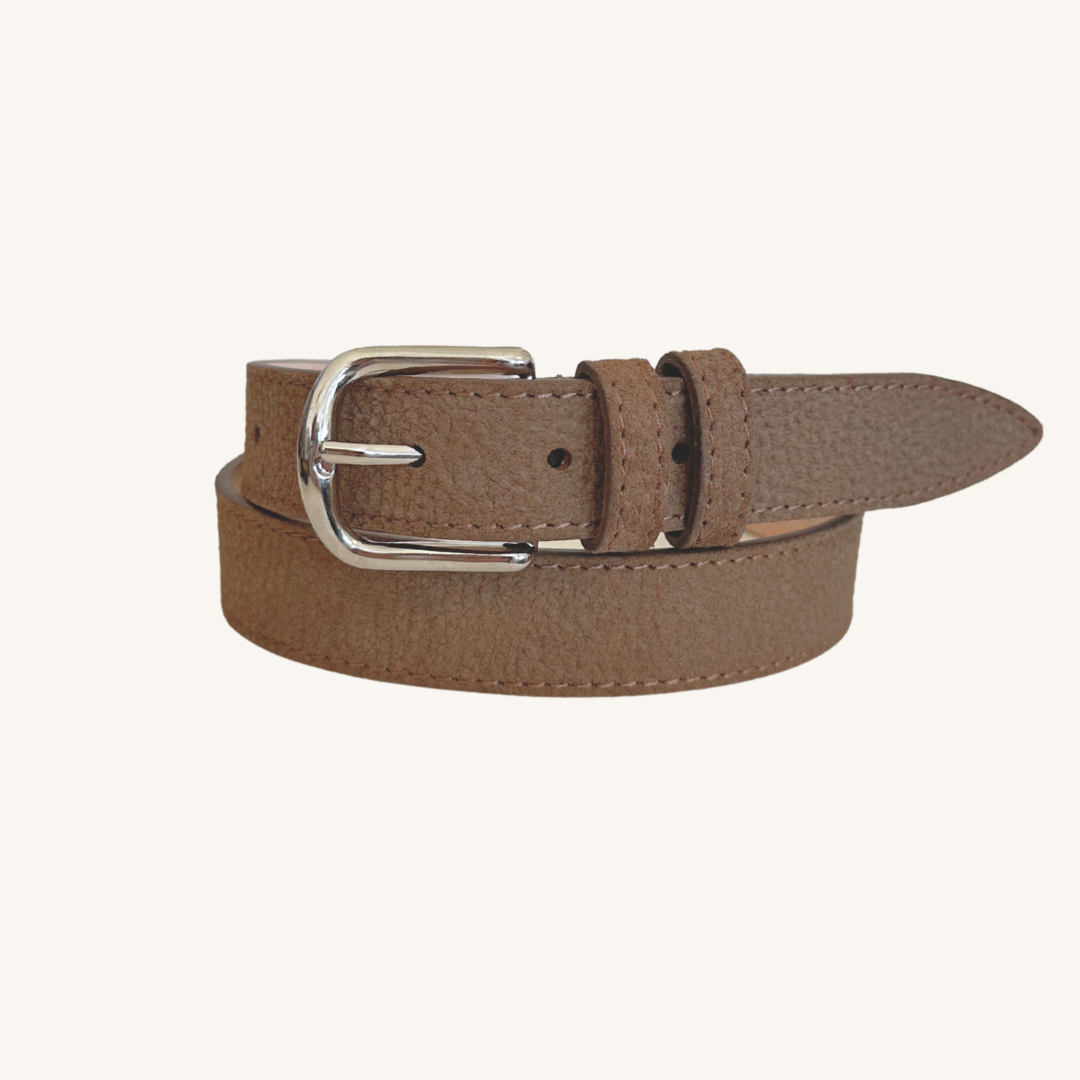 The new embossed suede belt has a square, rounded, shiny silver buckle. It is an essential piece of timeless clothing that will be in your wardrobe for years. The embossed suede feels unique, creating versatility and endless combination possibilities. The belt has soft nubuck leather on the inner side for a lightweight feel on your waist.