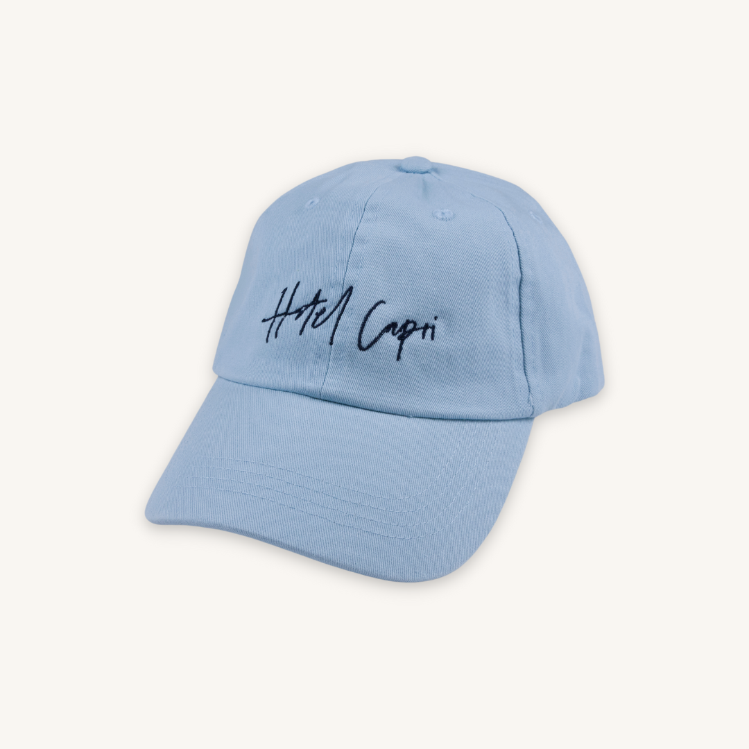 Let's check-in at Hotel Capri. The Hotel Capri Cap is inspired by the small island outside the beautiful coast of Sorrento in the south of Italy. A luxurious getaway that everybody wants a piece of - and now you can. The Hotel Capri Cap has a low fit dad style with a retro touch. Bring the cap to your summer adventures or wear it as part of your everyday look.