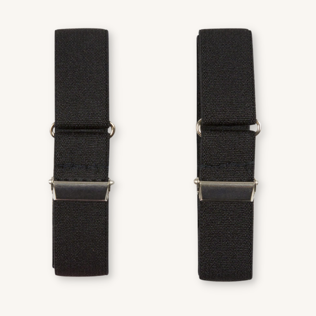 Elastic sleeve garter in black with metal adjustments. Helps you get the right length on your shirt sleeves.