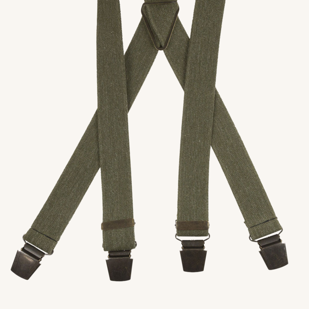 We manufacture most of our suspenders by hand in our factory in Malmö, Sweden. A timeless classic piece that has a melange green colour with bronze-coloured clips. Perfect to wear to your everyday style but also for a more dressed look. Available in a variety of colors.