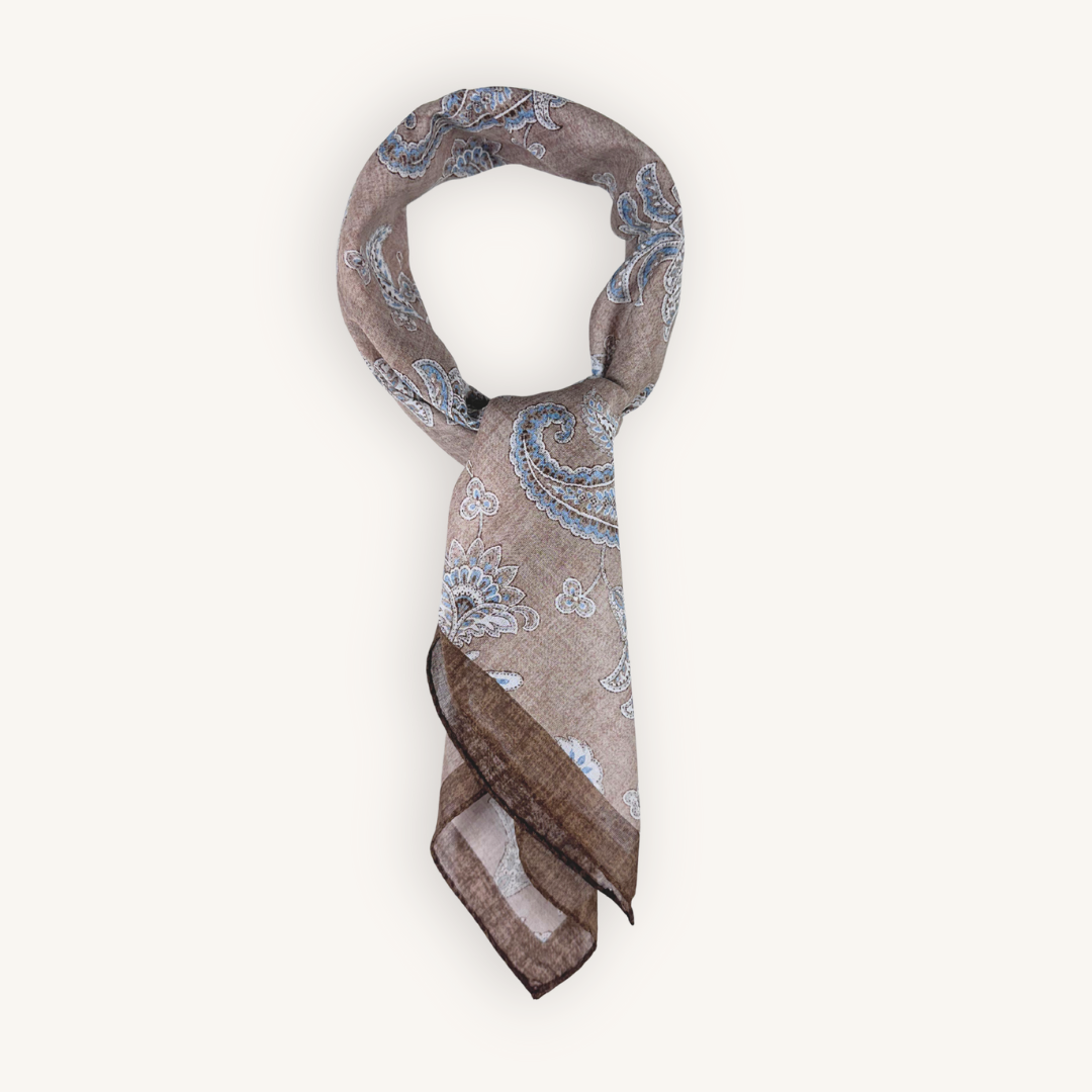 Bandanas are a great addition to your everyday style. With a lovely paisley pattern printed on a melange beige ground with a brown border. Our Bandanas are crafted from high-quality materials. They are a fantastic addition to your everyday style. With its easy-to-wear design, this bandana allows you to achieve a stylish look in seconds. Simply tie it in a loose knot and pair it with a knitted sweater, shirt, or T-shirt.