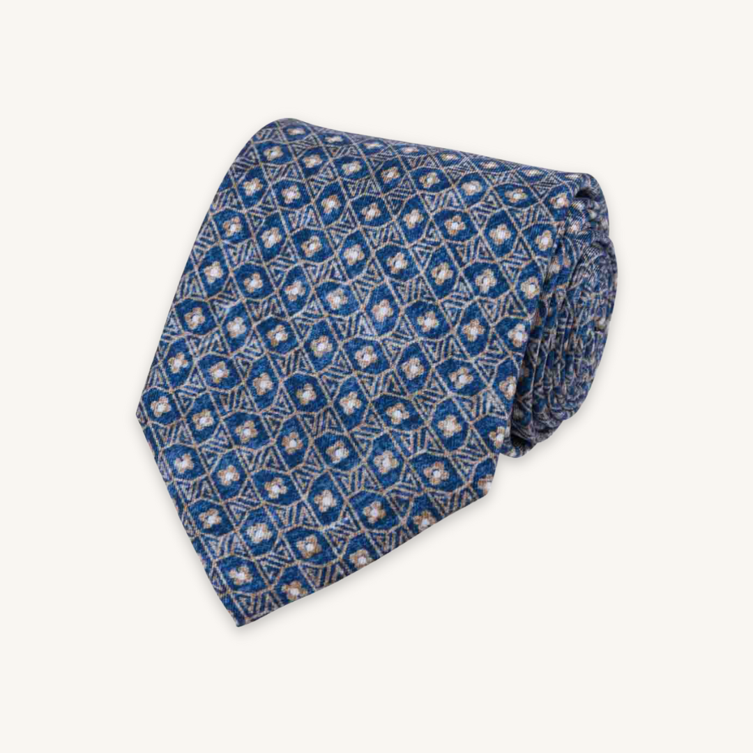 This sophisticated necktie is crafted from timeless silk twill material selected from the region of Como, Italy. It features a lovely blue melange base with a small floral pattern in a complementary beige colour. This tie is exquisite and versatile, suitable for a wide range of occasions. It's also the perfect choice for a contemporary and stylish appearance.