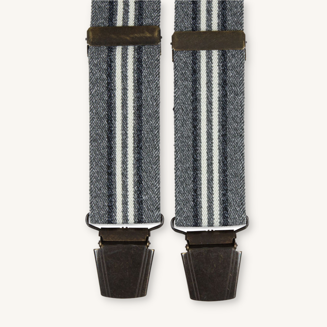 We manufacture most of our suspenders by hand in our factory in Malmö, Sweden. A beautiful melange grey and a striped piece that has bronze-coloured clips.