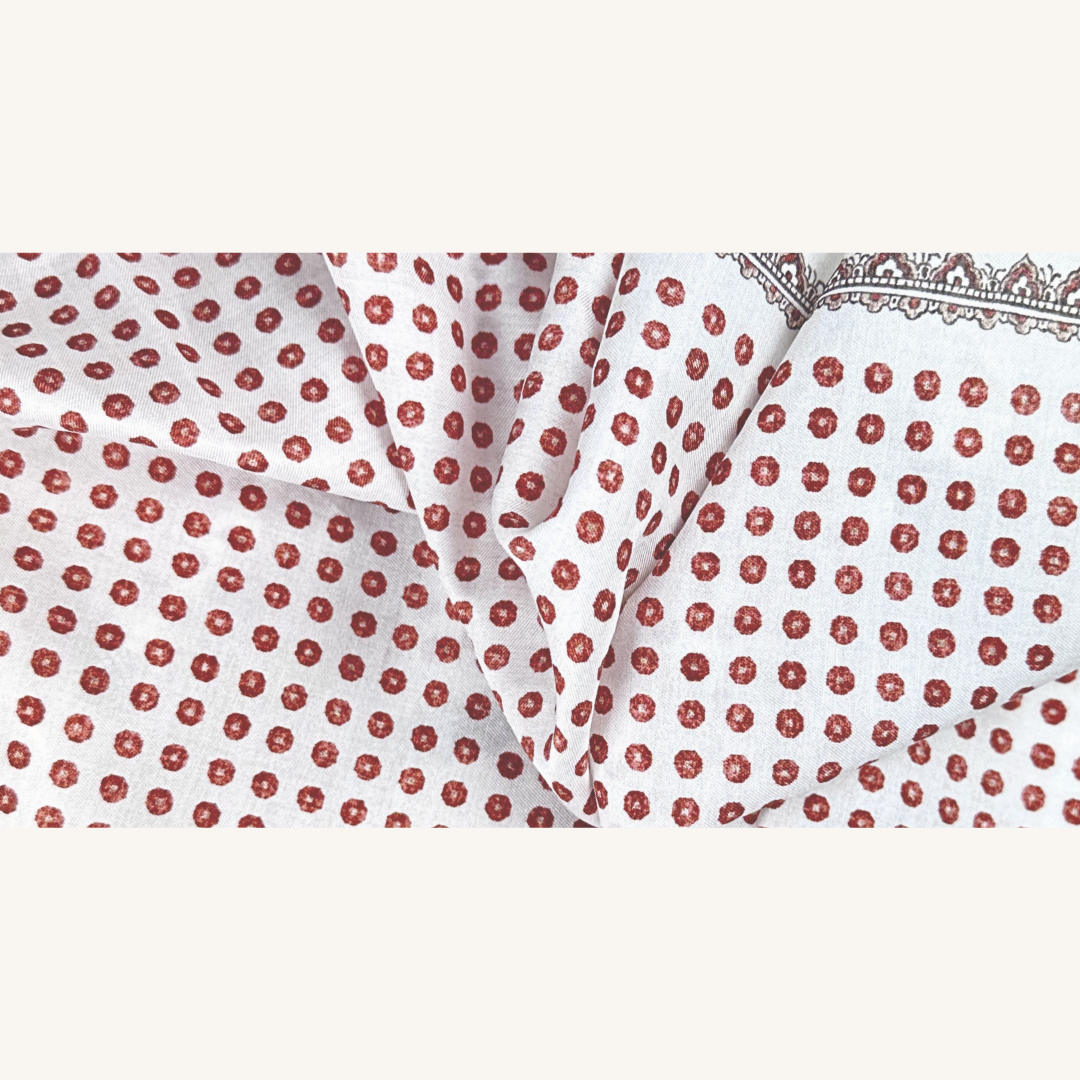 Bandanas are a great addition to your everyday style. This elegant bandana features a small orange dotted pattern on a white ground, with a detailed border. Our Bandanas are crafted from high-quality silk-cotton materials. They are a fantastic addition to your everyday style. With its easy-to-wear design, this bandana allows you to achieve a stylish look in seconds. Simply tie it in a loose knot and pair it with a knitted sweater, shirt, or T-shirt.