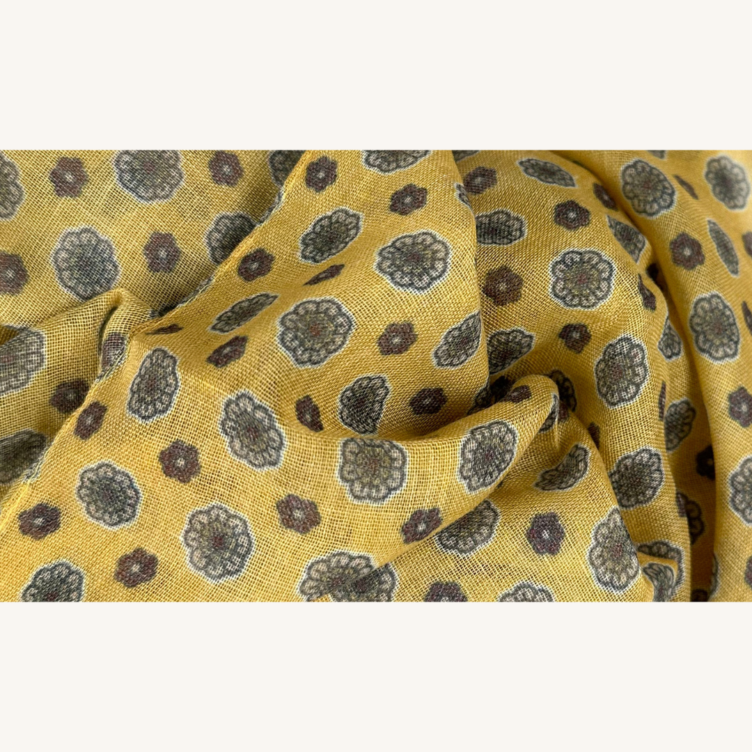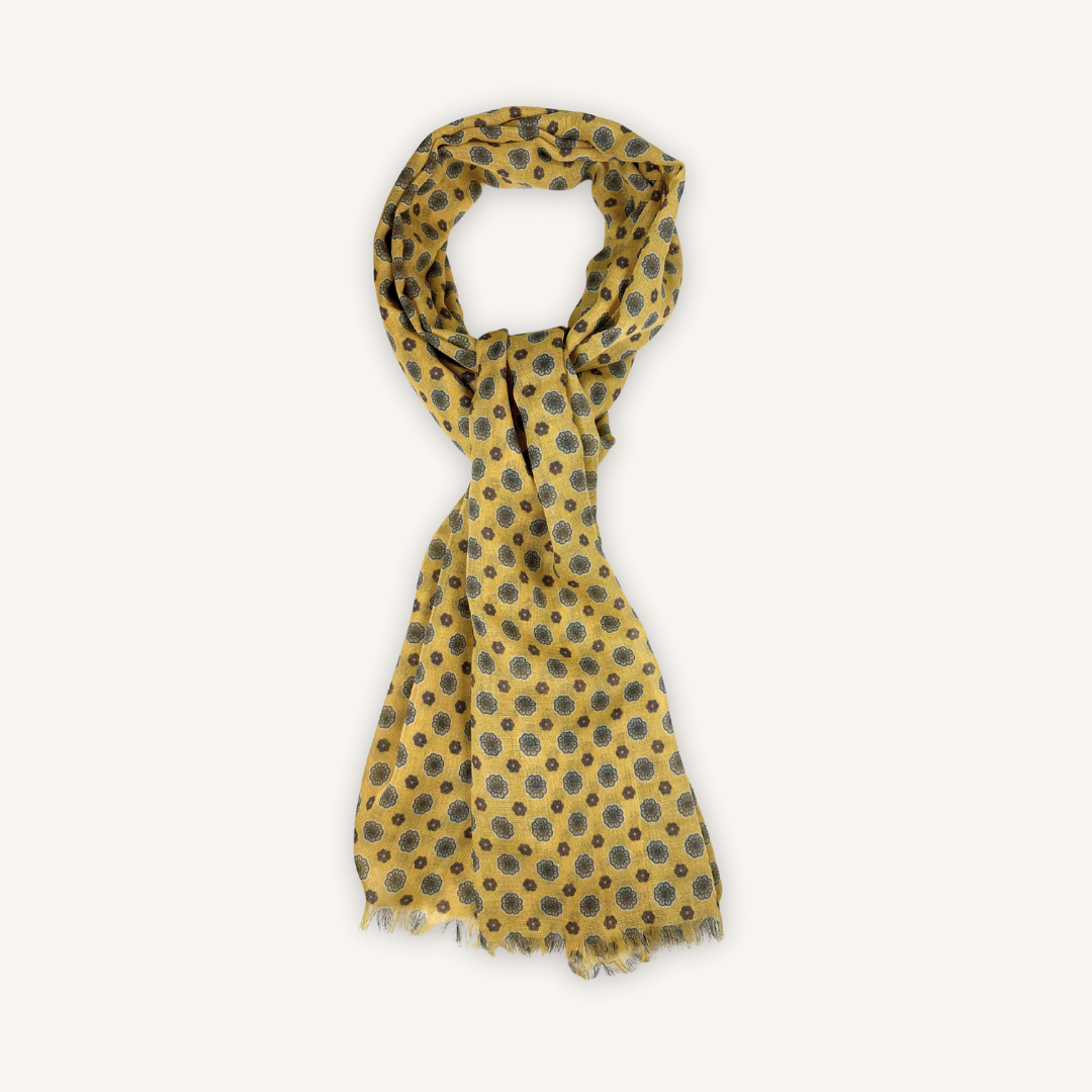 Introducing a beautiful, soft, comfortable spring scarf with a lovely floral pattern printed on summery yellow ground. This soft cloth can be draped over the lapels of your suit jacket or sweater, making it an ideal accessory to combine with your everyday look and add that extra touch of style. It is tipped with light fringes.