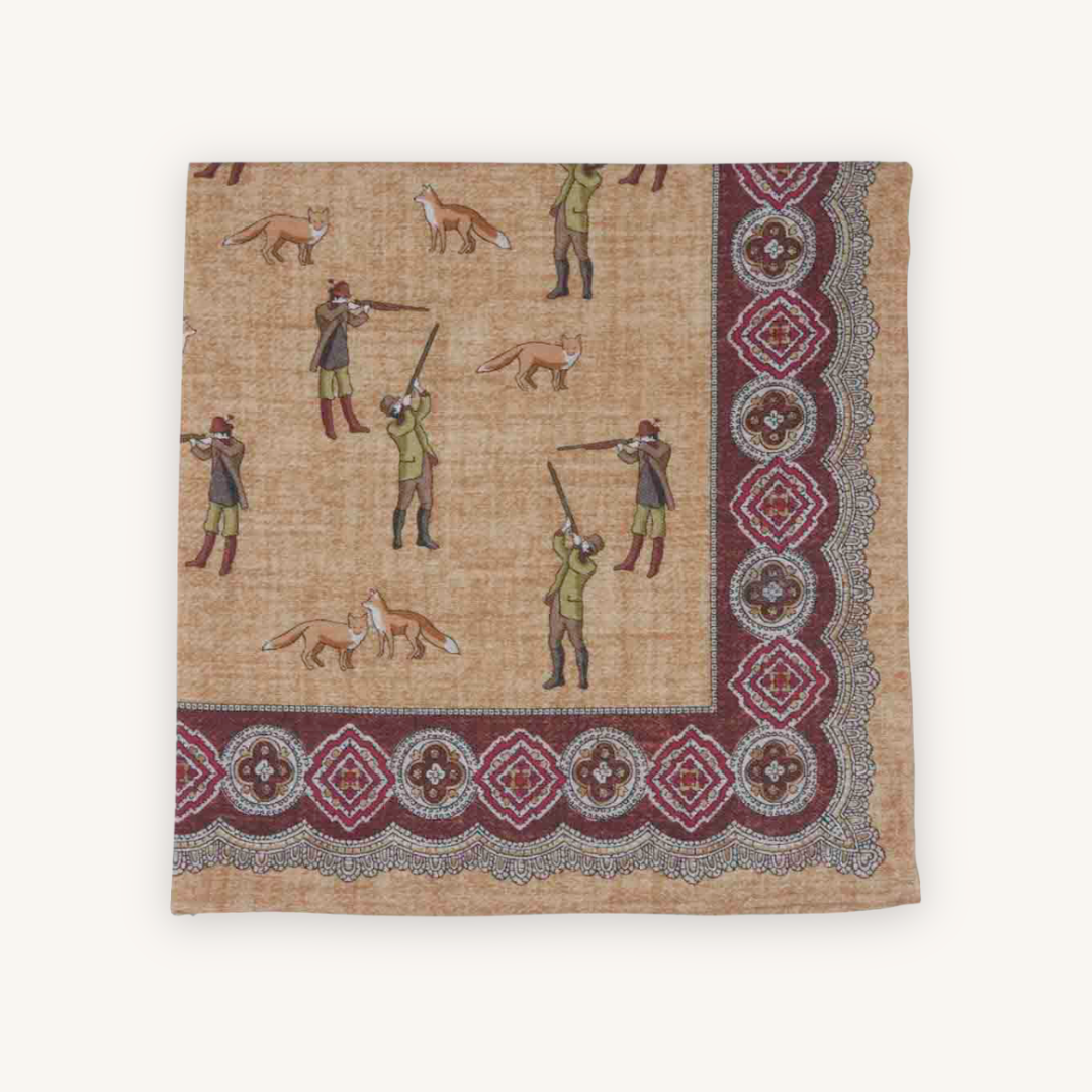 Wool and Cotton blend pocket squares feature detailed hunting patterns on a rich, warm melange yellow ground. The lovely pattern adds an extra twist to your ensemble. Enhance your attire by tucking this Pocket Square into your jacket pocket. Its luxurious texture and detailed pattern effortlessly elevate your look, making a statement of timeless elegance and impeccable taste. Why not add a solid tie to match it?