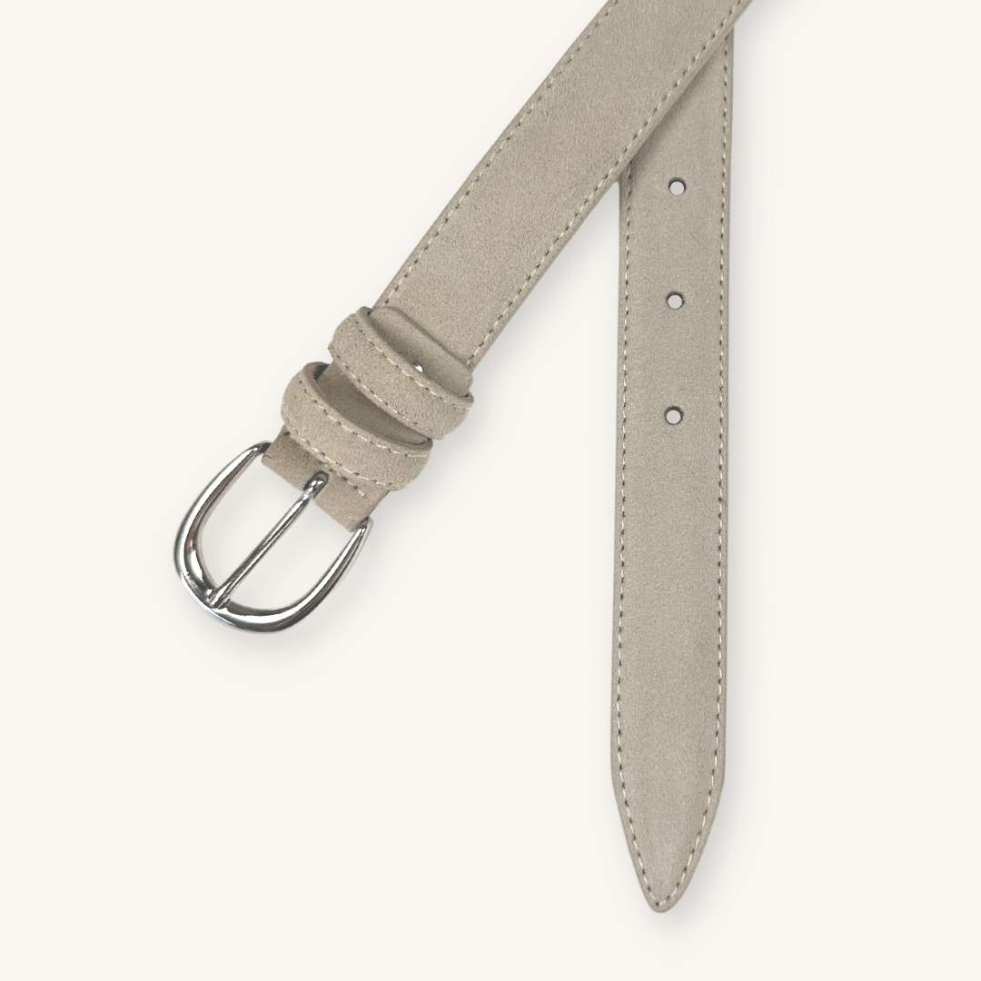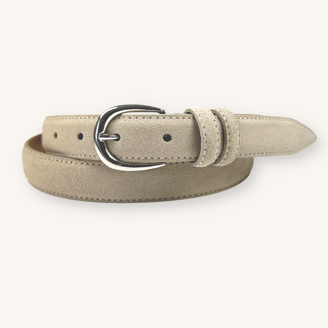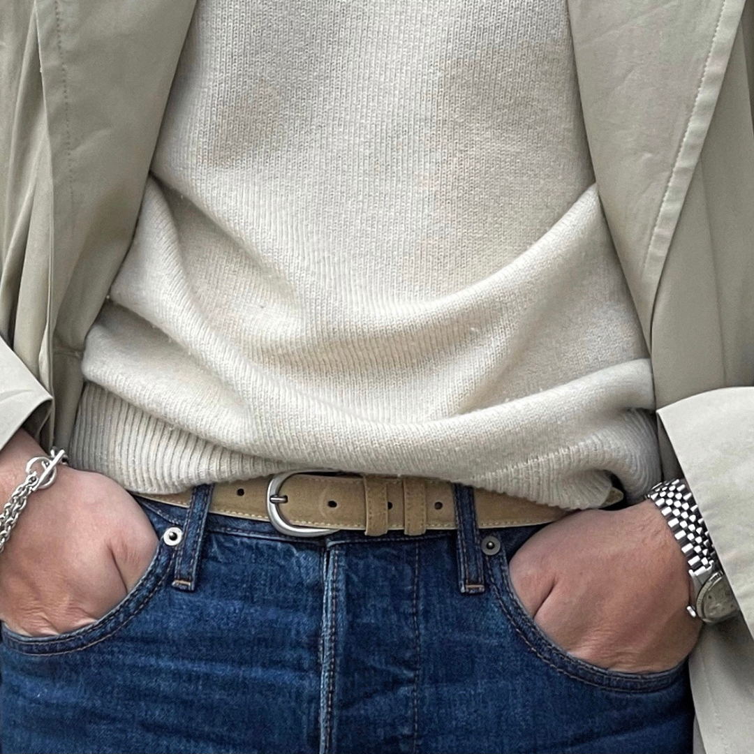 Detta smalare bälte i sandfärgad mocka med ett rundat spänne är en klassiker att ha denna tiden på året. Vi har valt att sätta extra mjukt läder på insidan av bältet för att ge en mjuk bekväm känlsa när du bär det. För en mer dressad look bär det till ett par chinos. För en mer avslappnad stil, bär det till ett par tvättade jeans.