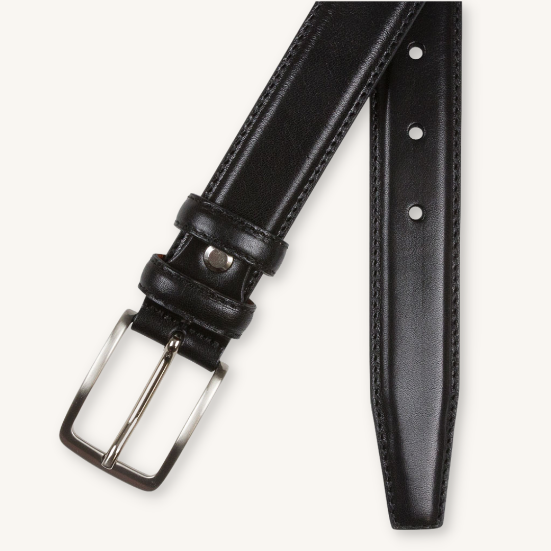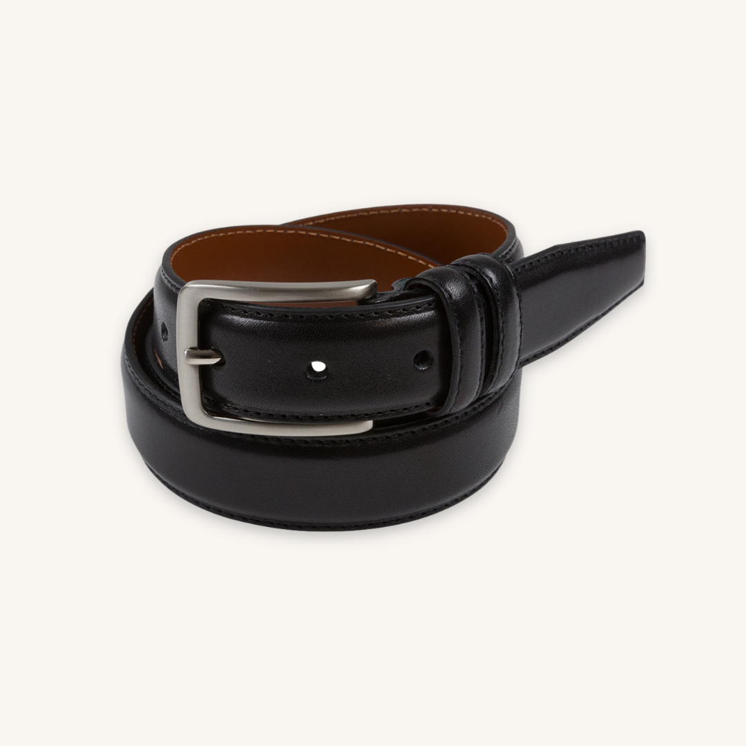 Ett stiligt och klassiskt läderbälte i svart. Bältet kommer med ett silverfärgat spänne. Ett måste i varje mans garderob. Tillverkat i Italien.