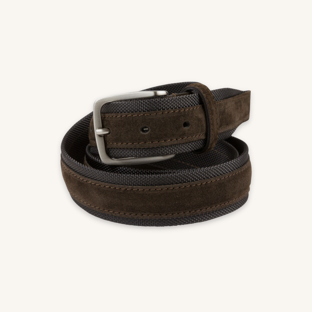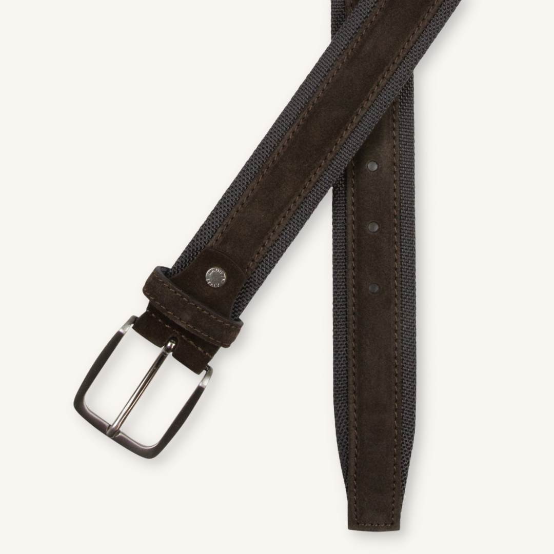 Ett brunt mockabälte med inslag av textil. Ett bälte där mocka och textil skapar en intressant kombination. Det borstade spännet gör bältet mer ledigt.