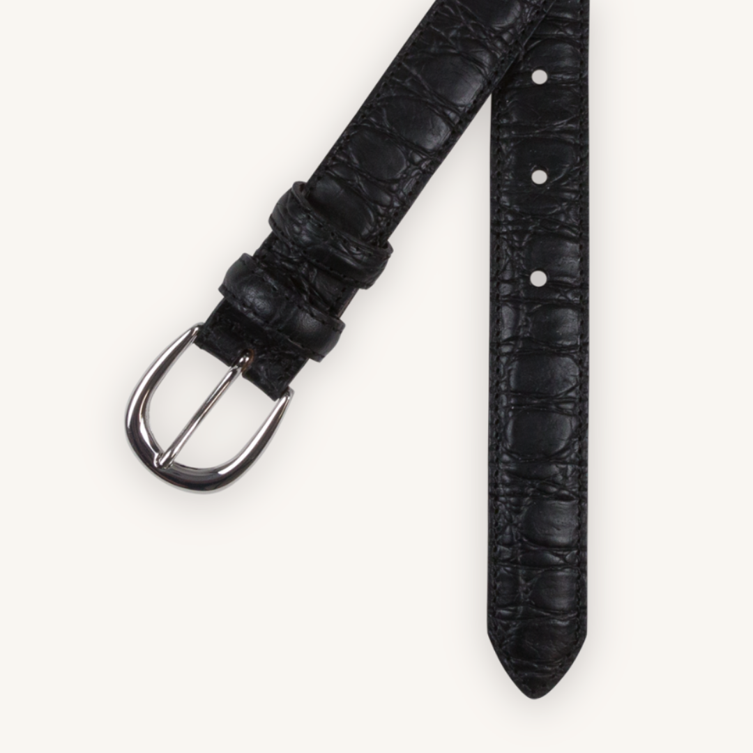 Vårt klassiska 25 mm bälte tillverkat av svart krokopräglat läder med ton-i-ton-sömmar runt kanterna kombinerat med ett rundat, glänsande silverspänne. Dess smala bredd gör den mångsidig för styling och kombination med olika outfits. Att lägga till mjukt nubuck läder på insidan gör att ditt bälte känns lättare och bekvämare i midjan.