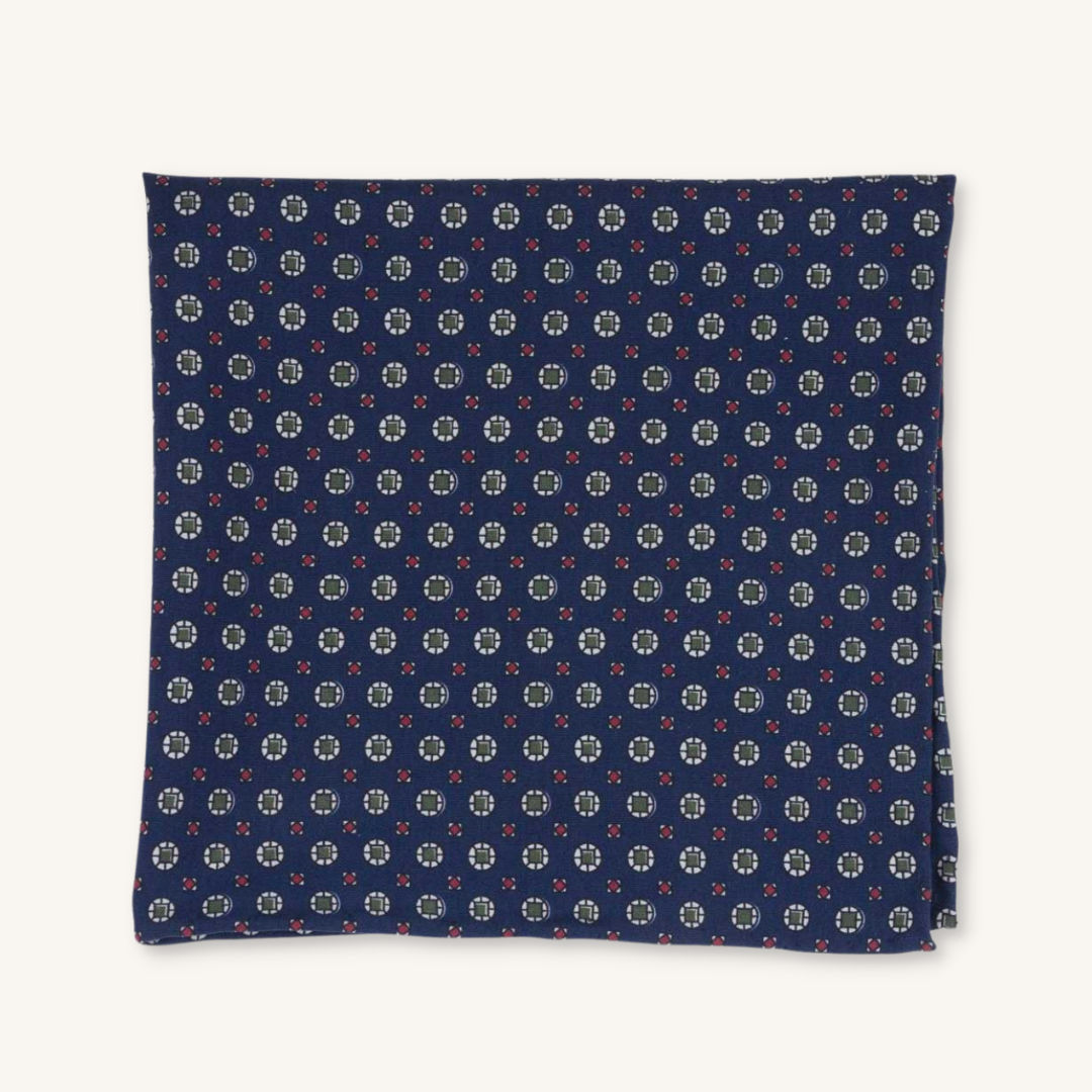 A patterned pocket square made of soft silk tela fabric. This one features a classic blue colour that will look great with your suit and tie or add an extra touch to your jacket. The silk tela fabric brings a matte gum feeling to it and softens the colours.