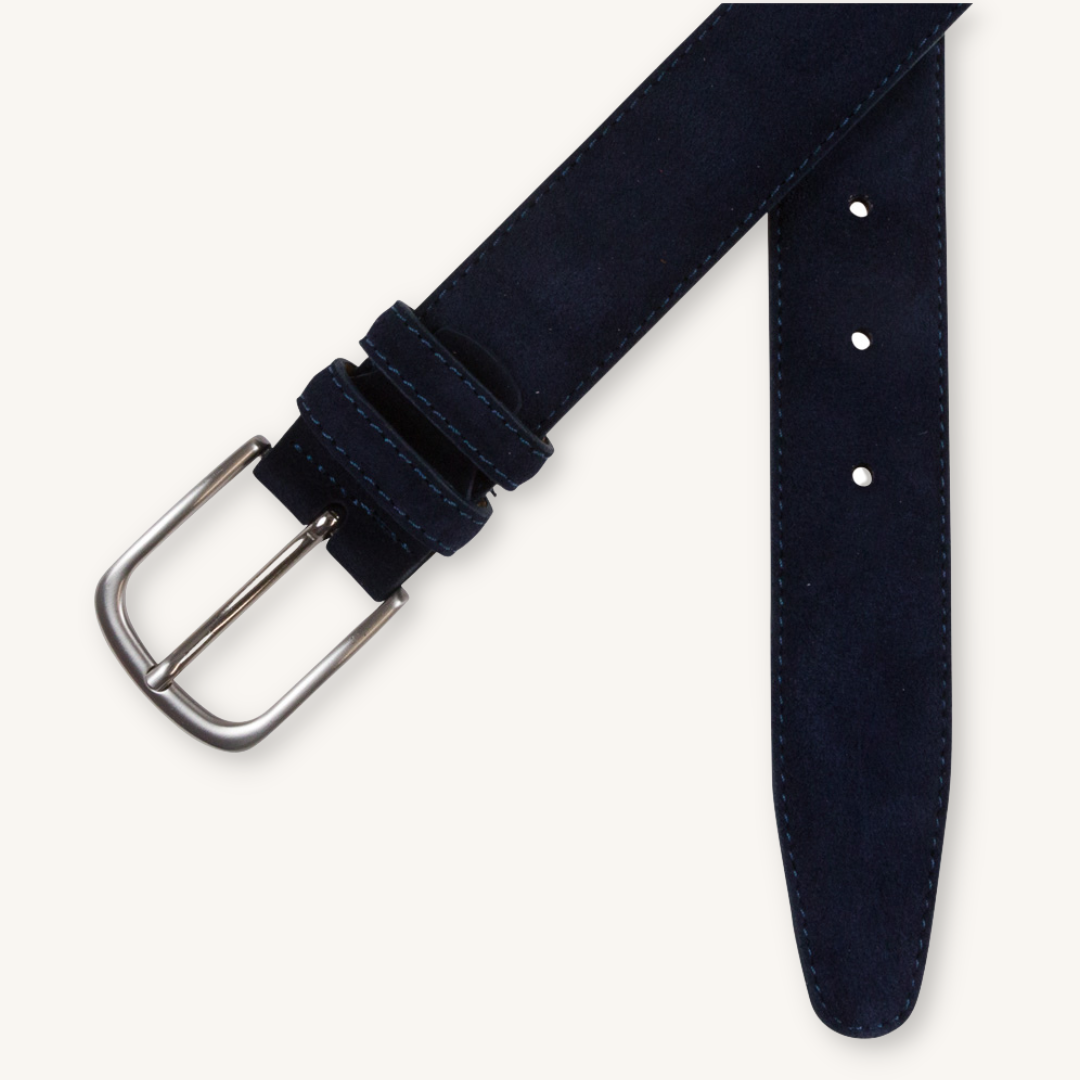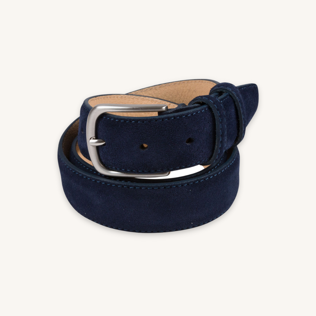 Ett klassiskt blått mockabälte med ett borstat rundat spänne. Bältet är extra mjukt eftersom vi har lagt till ett mjukare läder på insidan. Bältet kommer att bli mjukare desto mer du använder det.