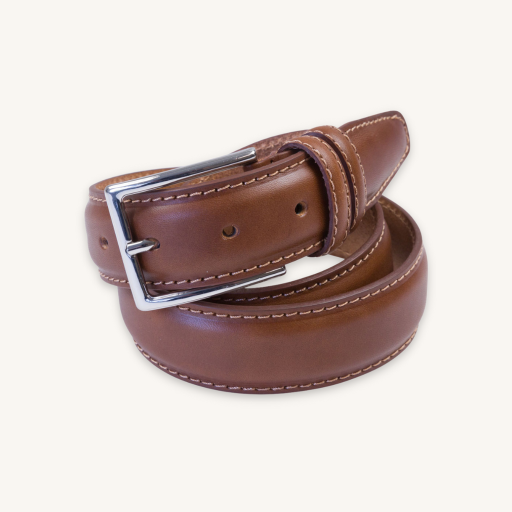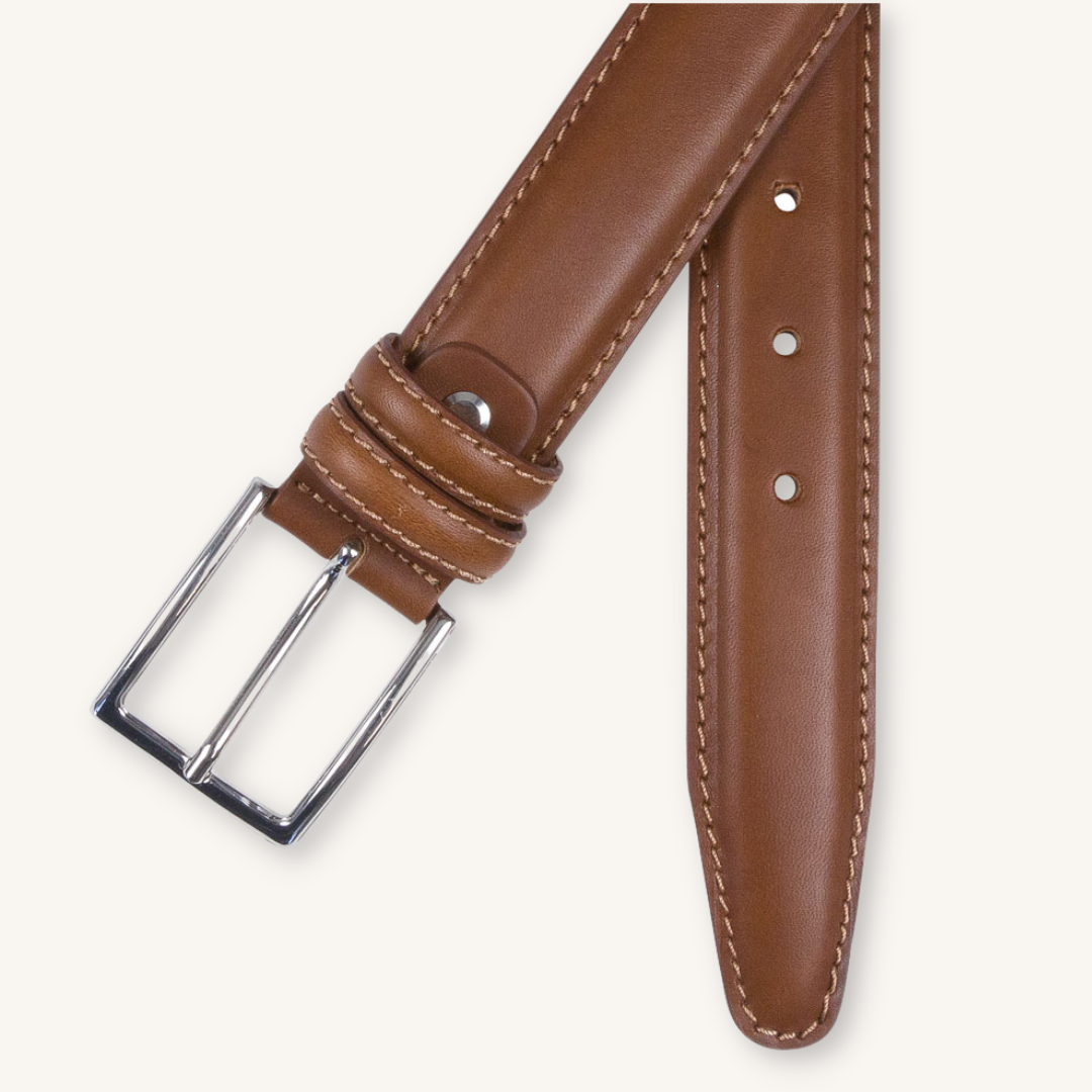 Läderbälte i färgen cognac med fyrkantigt spänne i silverbeläggning. Detta bälte är en snygg detalj att bära med kostym eller till jeans vilket gör det till ett mångsidigt val. Ett bälte som kommer bli en favorit i din garderob.