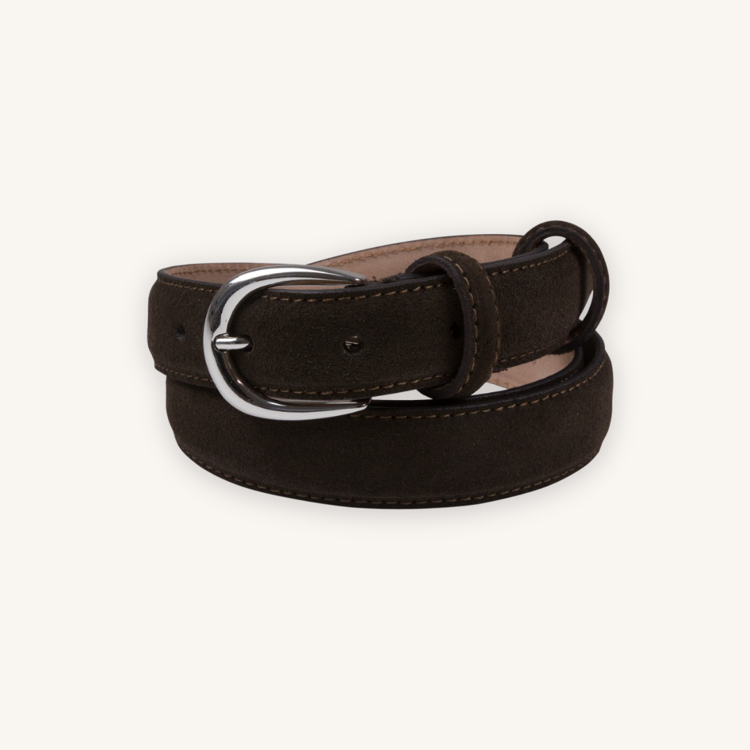 Vi är glada över att introducera ett nytt mörkbrunt färgalternativ i vårt klassiska mockabälte, som är en av våra storsäljare. Bälte har ett rundat silverfärgat spänne och är en mångsidig accessoar som kan bäras på många olika sätt, vilket gör det till ett måste i allas garderob. Bältet kommer med ett mjukt nubuck läder på insidan som ger en mjuk och bekväm känsla runt midjan. Ett elegant unisex bälte att kombinera med din vardagliga och mer uppklädda look.