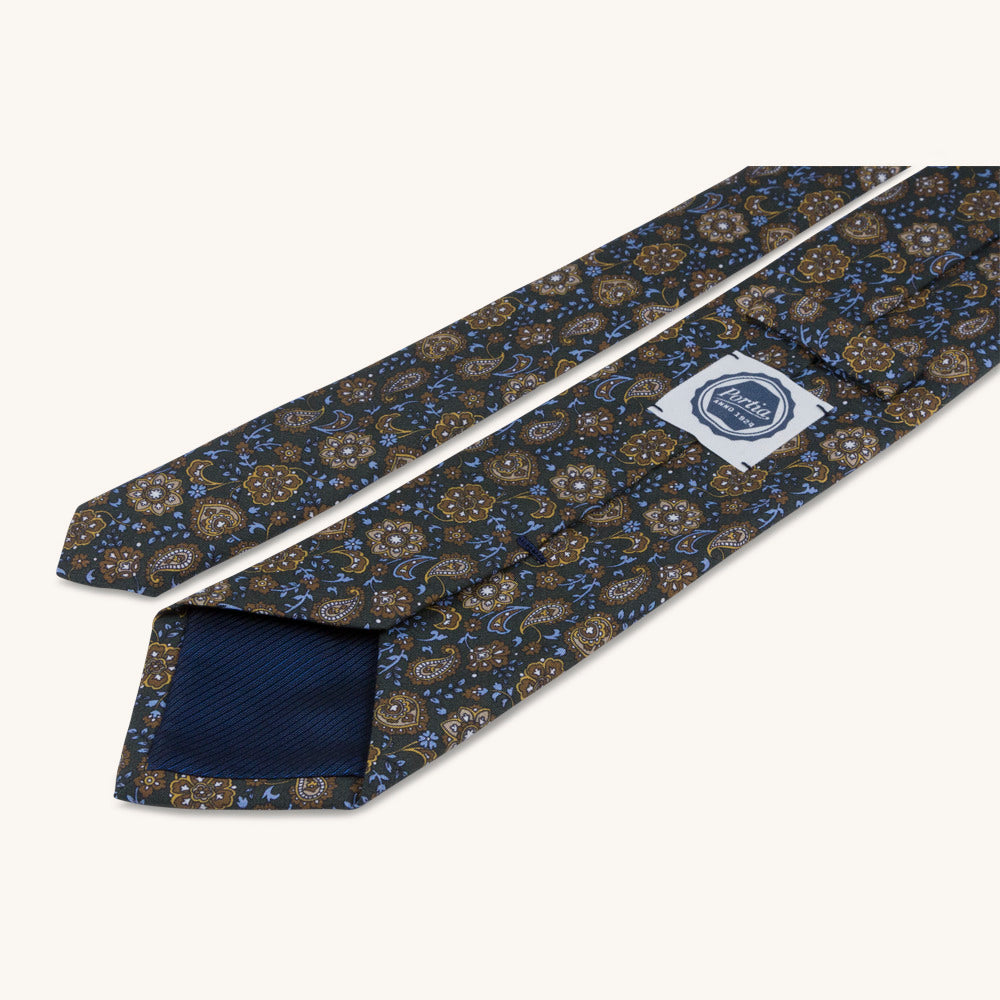A new floral and paisley pattern printed on a dark green ground. This tie is made from a matt silk fabric, which tones down the colours perfectly for this upcoming season. It also creates a tie that is ideal for a more modern look. If you prefer to match with a pocket square we would recommend solid wool or match with one in the same pattern.