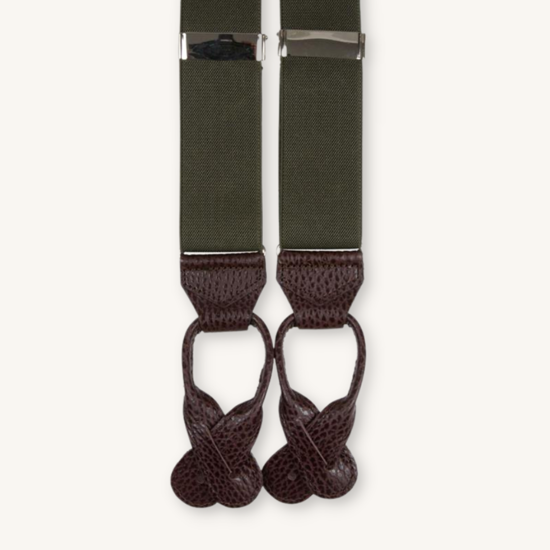 A pair of classic and elegant suspenders are a must-have in your closet. These come in a solid green elastic band combined with dark brown leather toggles. One of our most exclusive suspenders. The elastic band is double-coloured on both sides, making them extra elegant and perfect to wear for a more dressed look. Made in Italy.