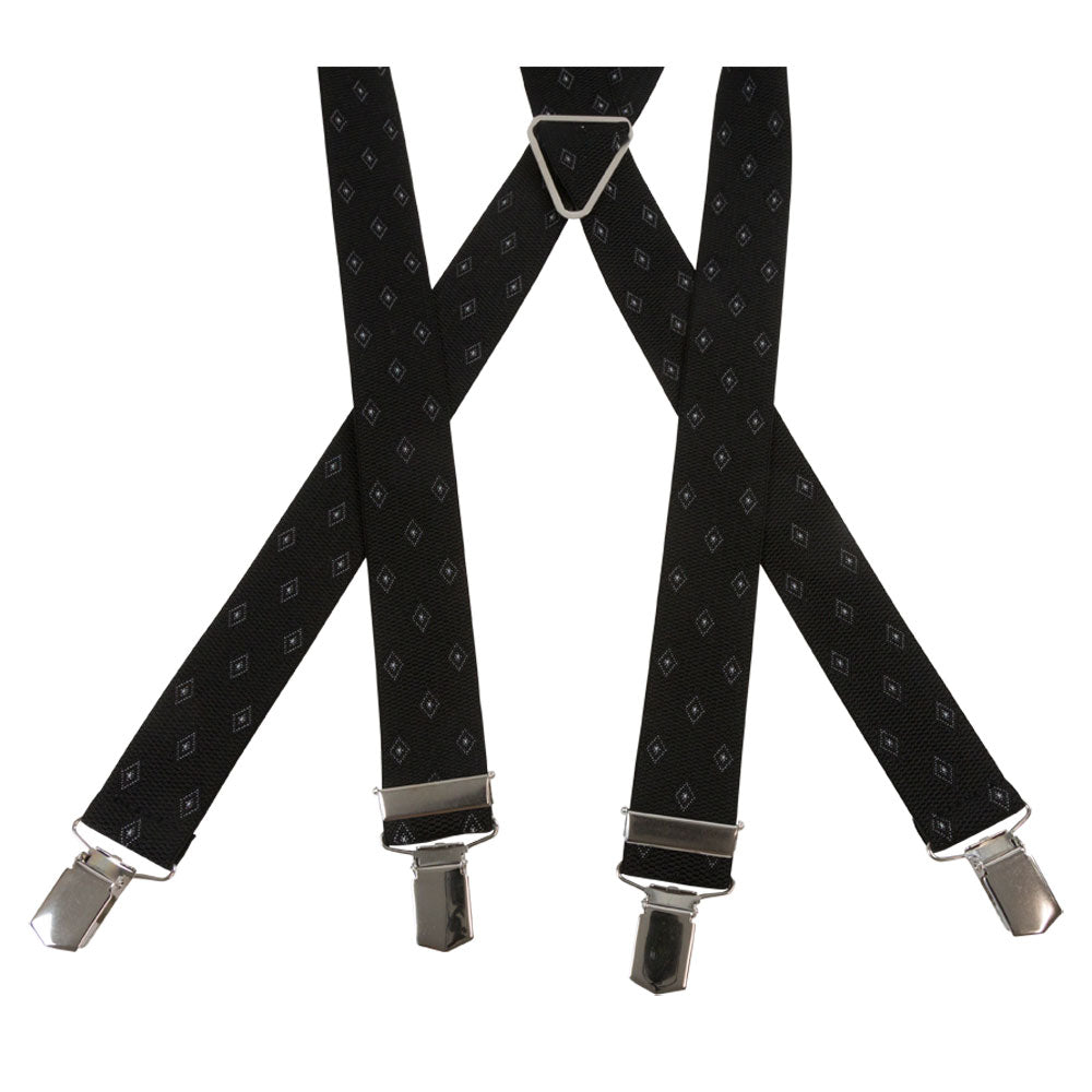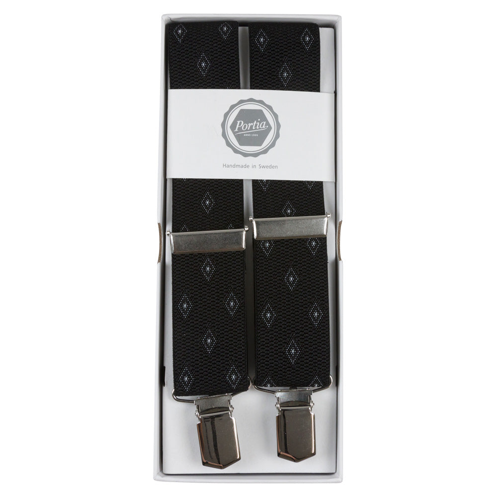 Upptäck våra mest exklusiva svarta hängslen i ett mönster bestående av små ljusa diamantformer med klämmor.