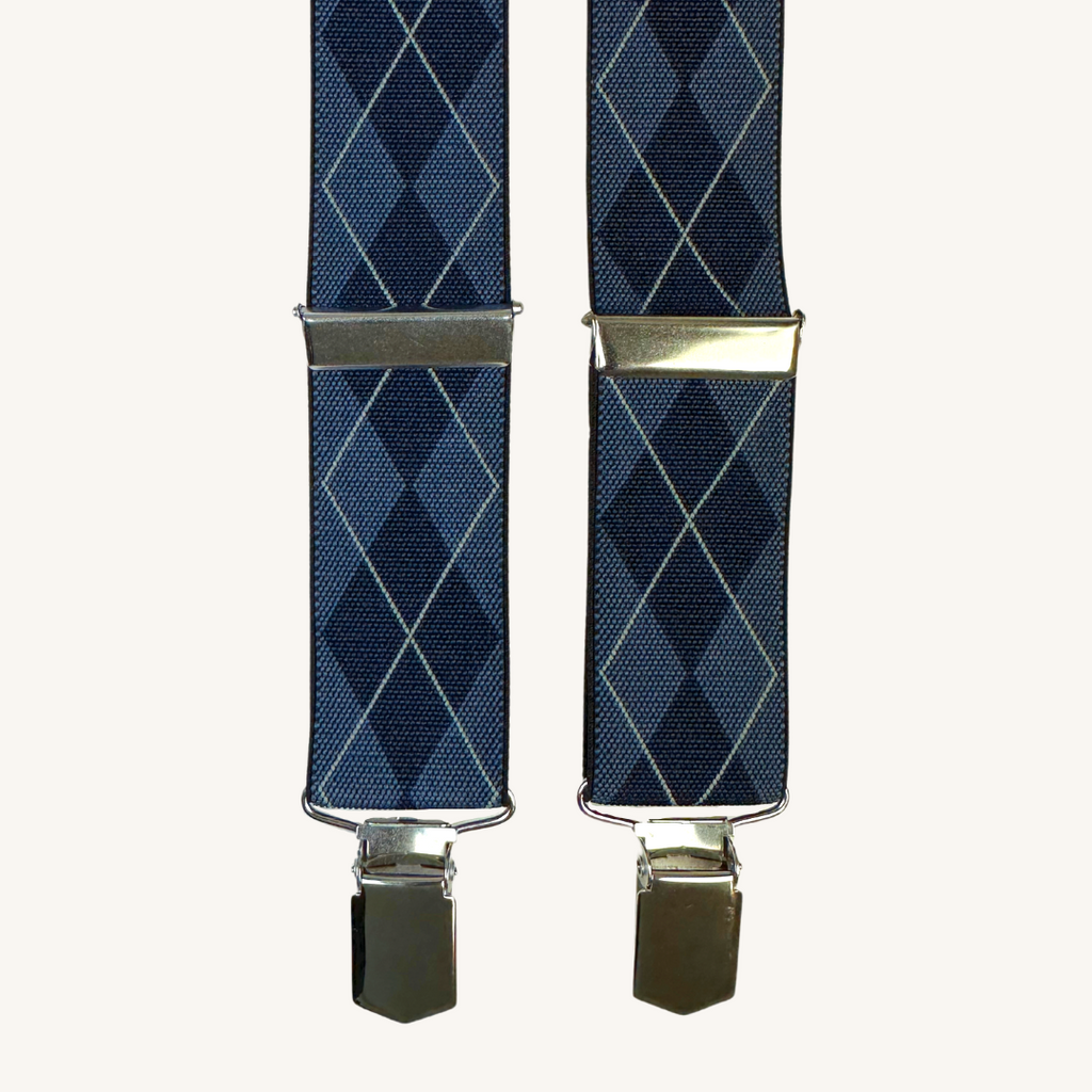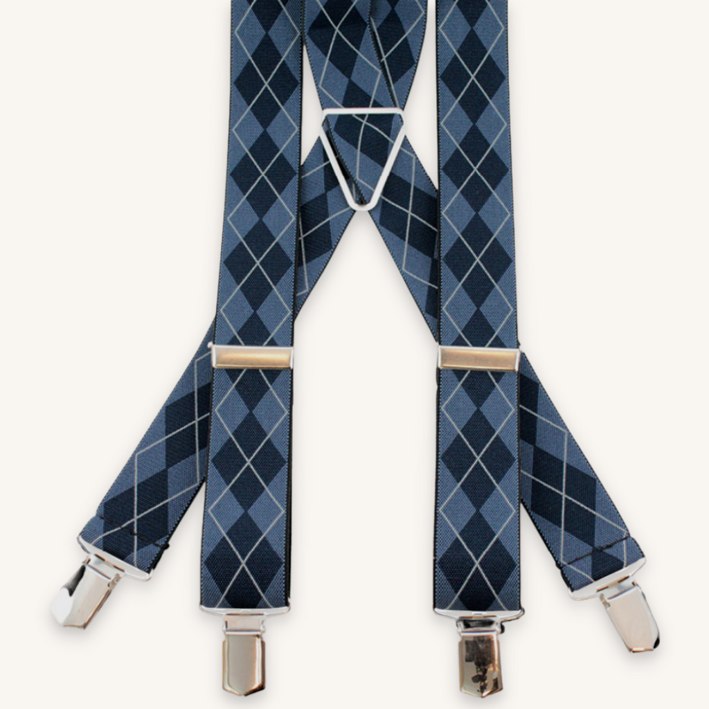 Blå hängslen. Klassiska blå hängslen, i ett argyle mönster för en klassisk look. Med klämmor och bekväma remmar som passar till nästan allt.